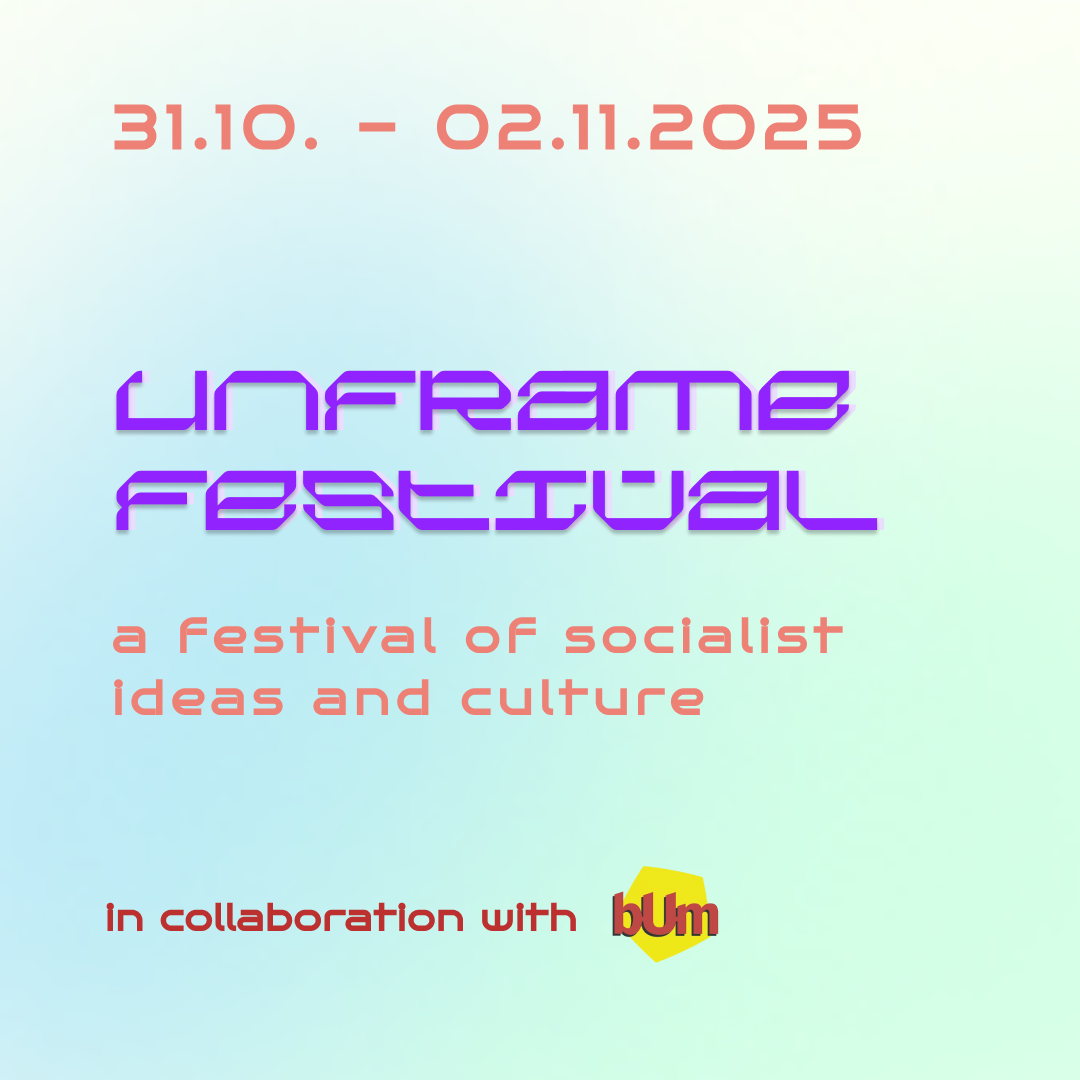 unframe festival is a three day socialist-cultural festival at bUm in Berlin with various themes in English and German. We invite you to learn and exchange about political ideas. Join us in a weekend full of lectures, panels, workshops, live music, film screenings, food, bazaar and more.