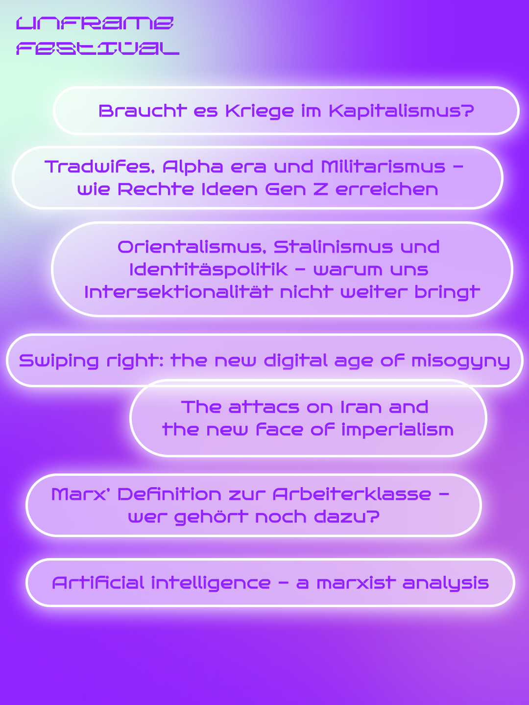unframe festival is a three day socialist-cultural festival at bUm in Berlin with various themes in English and German. We invite you to learn and exchange about political ideas. Join us in a weekend full of lectures, panels, workshops, live music, film screenings, food, bazaar and more.
